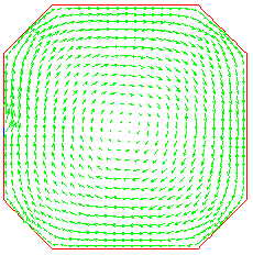 In this stage we will solve the flow field for the given grid, and look at the results.The main user interface is a dialog box and a menu bar. The dialog box will show intermediate results from the calculations and other messages. The menu is used for starting different sub-modules of the SSIIM program.In the first dialog box to make the control file, we gave a Manning's coefficient, water discharge, downstream waterlevel and dimension of the geometry. This is all we need to calculate the flow field with the Navier-Stokes equations. To start the solution of the Navier-Stokes equations you select the option Computations from the main menu. Then select MB-Flow from the pull-down menu. After this, push the update button on the dialog box to see how the residuals develop. The dialog box shows the residual for all the six partial differential equations that is solved for the water flow calculation. The water flow calculation is converged when all the residuals are under 0.001.After convergence, we want to see the results. Choose the Graphics option of the main menu, and the Map option in the pull-down menu. This gives you a graphics view of the grid as seen from above. Choose Graph from the menu in the map window, and Velocity from the pull-down menu. Then you see the velocity vectors. You can scale and move the plot by using the <Page up>, <Page down> and arrow keys. You can also scale the velocity vectors by choosing Scale and VarEnlarge/VarShrink. And you can see the other parameters than the velocity by choosing different variables in the Graph pull-down menu.The velocity vectors are not too exciting for this channel and to make a more complex flow pattern, you need to change the grid. This is done in the third stage.