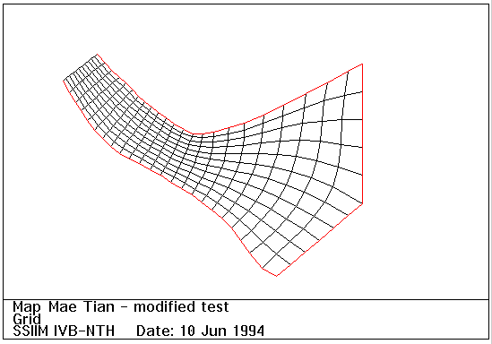In this stage we will concentrate about the grid editor. But first, we want to show several graphic windows on the same time on the screen. Therefore, use the mouse and push the main menu down in the lower left quadrant of your screen. Scale the map window so that it fits in your upper left quadrant of the screen. To fit the grid in the window, choose the Scale option in the map window and Shrink in the pull-down menu together with the Move option in the map window and left, down options in the pull-down menu.Then start the grid editor by choosing Input Edit from the main menu bar and GridEdit from the pull-down menu. Scale and move the window and the grid so that it fits in your upper quadrant of your screen.To edit the grid, you first choose some points which will not be affected by the interpolation routines. This is done in a special modus of the editor. This modus is invoked by choosing Define from the menu and Set NoMovePoints from the pull-down menu. To verify that this modus is chosen, the letters "Point mode, 0" is shown on the lower part of the editwindow. The integer shows how many points you have chosen. We want to choose four points, all on the upper boundary of the grid. A point is chosen by clicking with the mouse on a grid intersection. If successful, a blue star emerges at the grid intersection. For a further explanation on which points to choose, see Fig. A. After choosing the points we return to normal modus. This is done by choosing Define and Set NoMovePoint again. We observe that this modus disappears because the text "Point mode, 4" disappears.